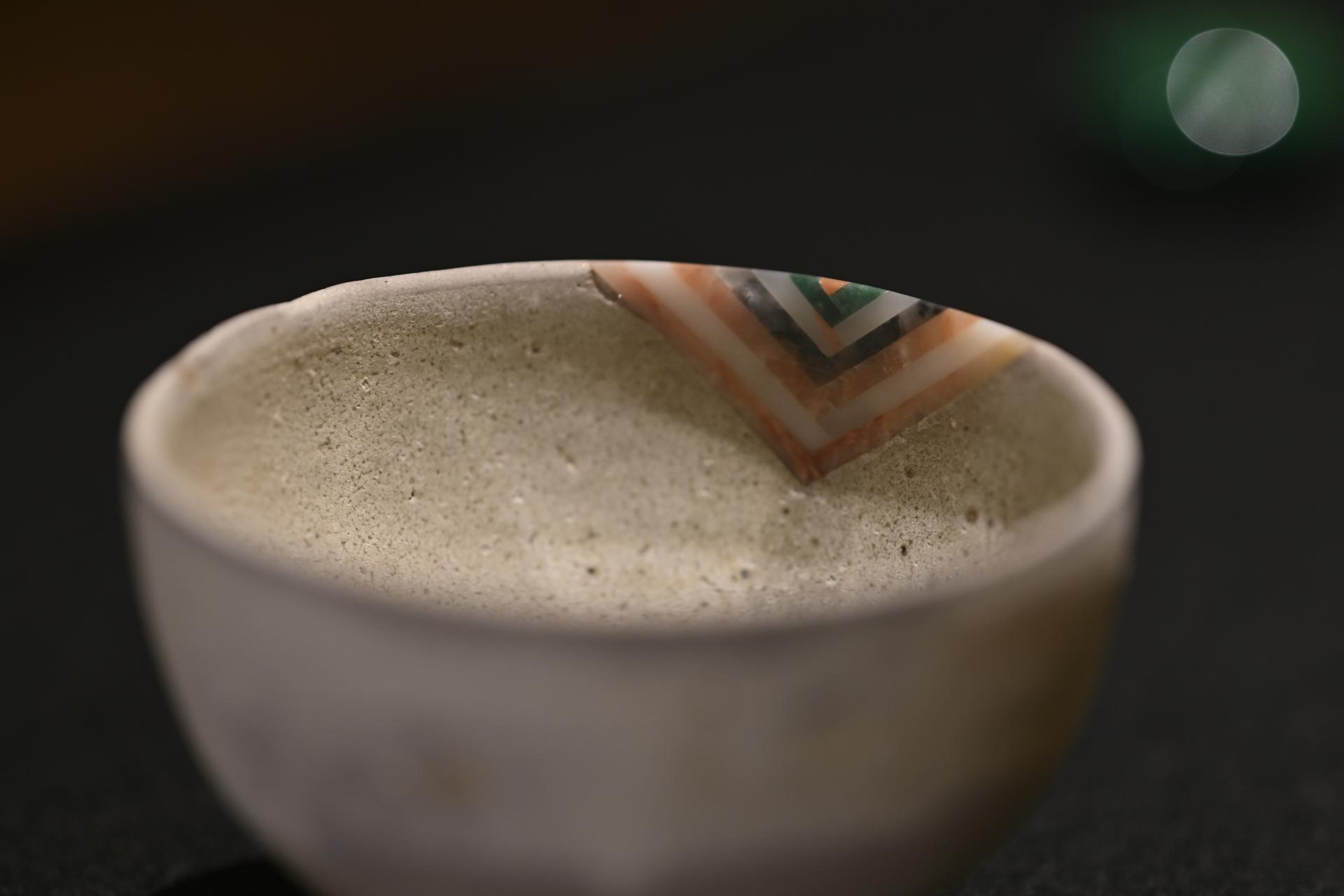 구연부는 다양한 색채석 조각을 얇게 갈아